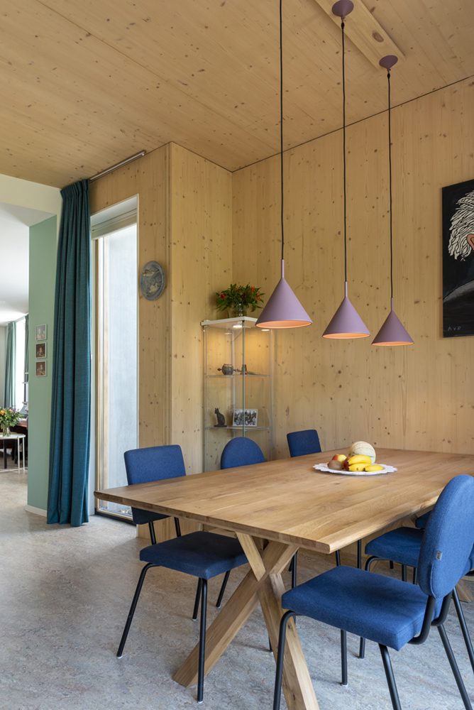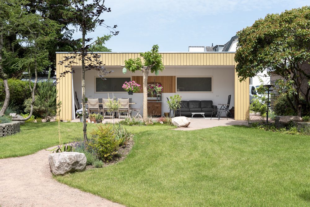 In de woningen gaan twee bevriende, oudere stellen wonen. De kavel is in tweeën gesplitst, maar zonder scheiding tussen de tuinen. Dit sluit perfect aan bij de wensen van de bewoners om gezellig samen te zijn in de tuin. De woningen zijn vergelijkbaar en beschikken over een veranda. De ontwerpkeuze om hout te gebruiken voor de achtergevel, komt terug in de omlijsting van de voordeur.