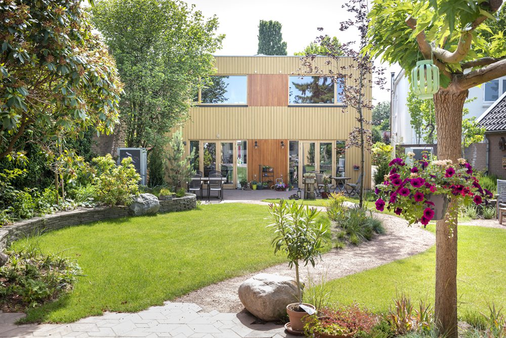 In de woningen gaan twee bevriende, oudere stellen wonen. De kavel is in tweeën gesplitst, maar zonder scheiding tussen de tuinen. Dit sluit perfect aan bij de wensen van de bewoners om gezellig samen te zijn in de tuin. De woningen zijn vergelijkbaar en beschikken over een veranda. De ontwerpkeuze om hout te gebruiken voor de achtergevel, komt terug in de omlijsting van de voordeur.